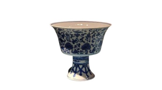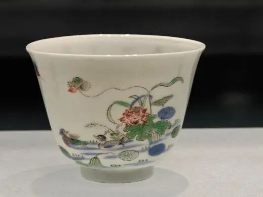 斗彩创烧于明朝宣德年间,以明成化年间器物最受推崇,其装饰方法是将釉下青花和釉上彩相结合,预先在 1300°C 下烧成的釉下青花瓷器上,用矿物颜料进行二次施彩,填补青花图案留下的空白和涂染青花轮廓线内的空间,然后再次入小窑,经过 800°C 低温烘烤而成。