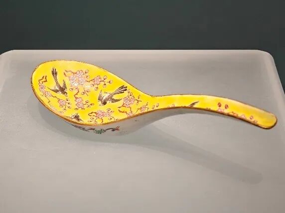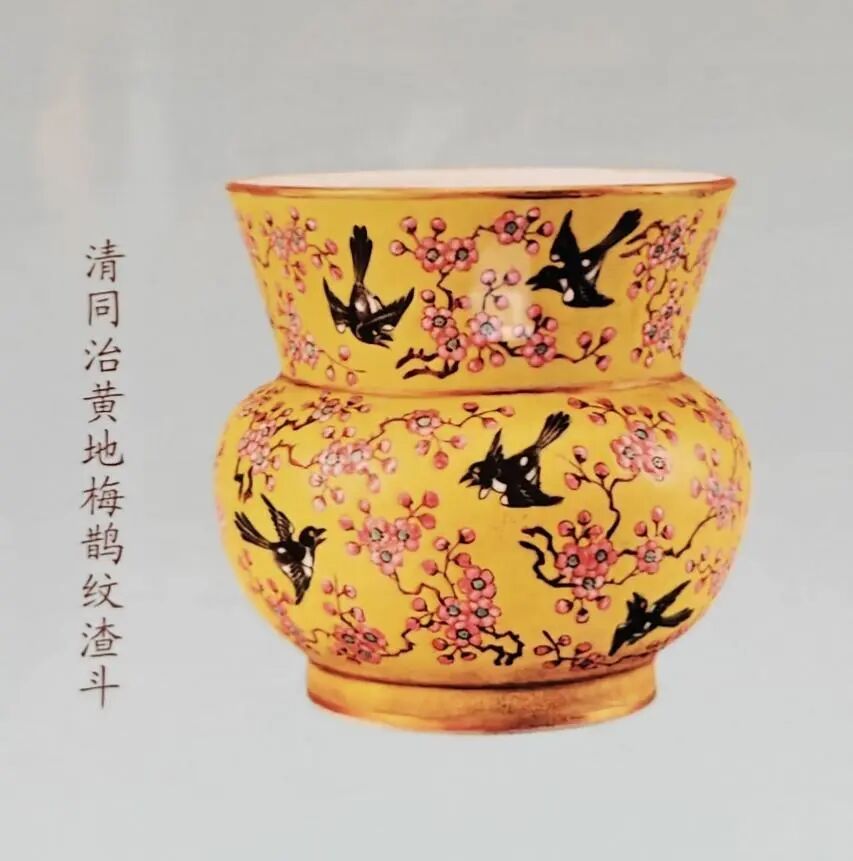 据《清档》内务府工业清册载,江西巡抚景福负责烧造“大婚礼造器”达七千余件,品类分 10 份,每份 24 种。其中以海碗、大碗、中碗、汤碗、怀碗、黄酒碗、酒杯、羹匙和大、中、小盘、碟等餐具为主,餐具以 148 件为一套,是晚清官窑中式餐具的典型器。这两件黄地粉彩梅鹊纹器物属于“黄地喜雀梅碗样”,纹样喜庆,寓意吉祥。