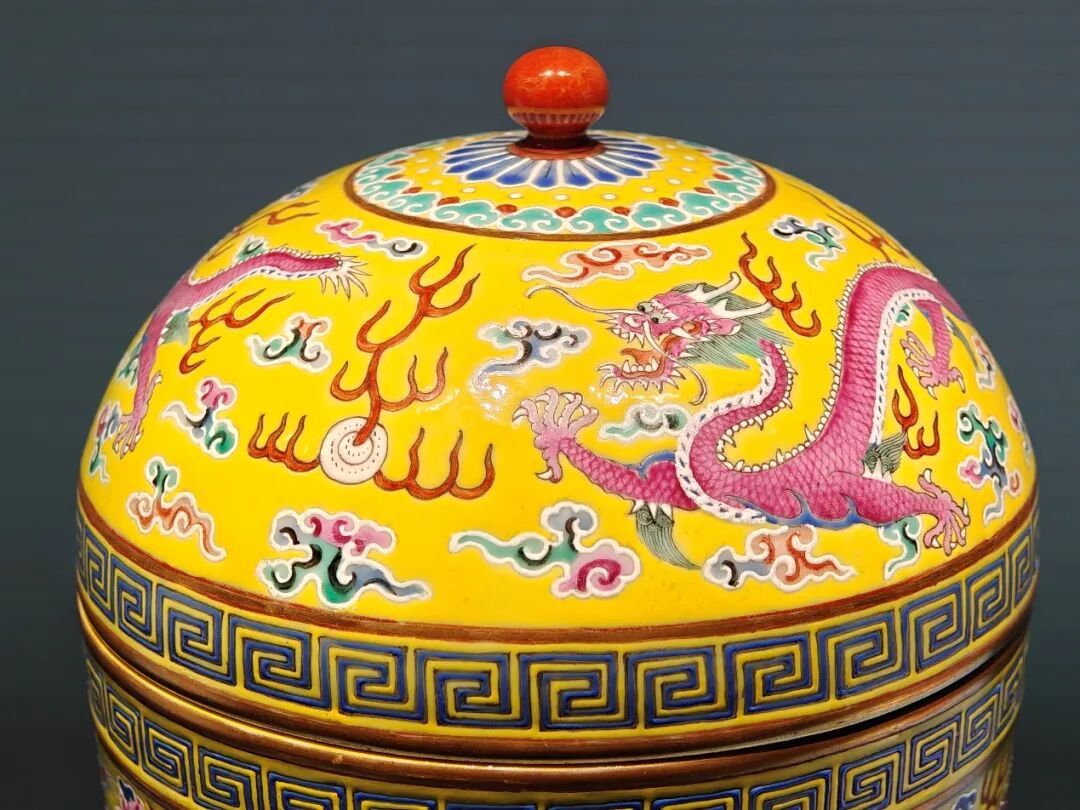 光绪年间黄地粉彩瓷,整体呈豆形,通身以粉彩绘制九只姿态不同的红、粉、蓝彩云龙,器盖上的红色珠钮璀璨夺目,体现着光绪时期御用瓷的品质特征。
