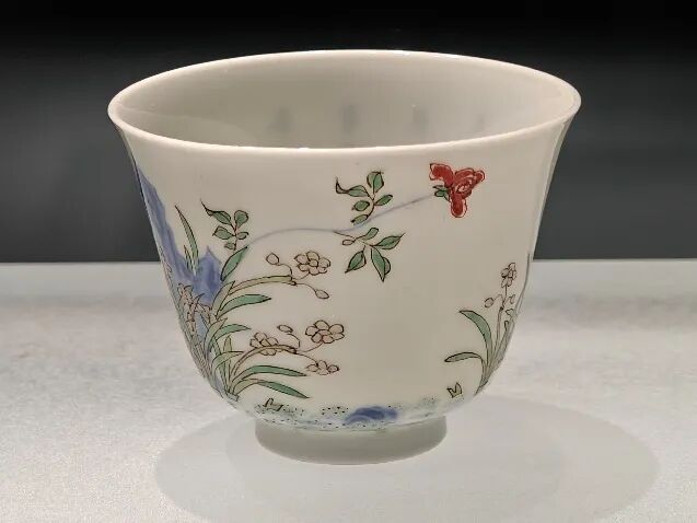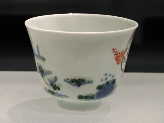 这套青花五彩十二月花卉杯胎体轻薄,釉质细腻,纹饰规范、款识精致。杯上诗尾有一篆书“赏”字,构图优美,画笔工细,将诗、画融于一炉。圈足内有“大清康熙年制”青花楷书款,代表了康熙朝景德镇御窑厂制作青花五彩薄胎瓷的最高水平。