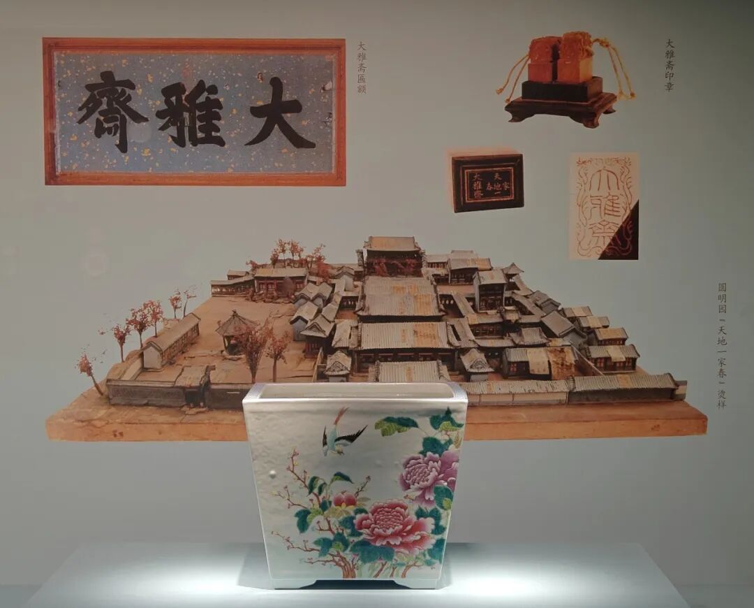 这件粉彩花鸟纹长方花盆器口下署款“大雅斋”,有篆文“天地一家春”朱文椭圆双龙戏珠印章。大雅斋是圆明园“天地一家春”建筑内的一处斋名。“天地一家春”原为慈禧在圆明园的住处,“大雅斋”遂成为慈禧的私人堂款。大雅斋瓷器多颜色浓艳,绘制花鸟纹饰,特征鲜明。光绪年间,慈禧太后谋划振兴瓷业,大雅斋瓷器是乾隆瓷器顶峰后清朝瓷业衰败后的重新崛起,也被称为整个中国官窑史的最后的绝唱。