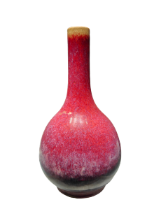 这件窑变釉瓶烧造于乾隆时期,造型端庄秀美,通体主要以红色调为主,釉层里同时又出现深浅不同的乳絮般的蓝色线条,在艳丽红釉中向下垂流,红蓝浸润,肆意随性,绚丽夺目,美不胜收。