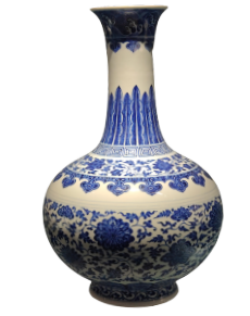 天球瓶是明永乐、宣德时期景德镇窑的创新器形,多以青花装饰。其器型多为直口球腹,好似天上落下的天球,故名“天球瓶”。这件青花天球瓶烧造于清朝光绪时期,造型稳重端庄,但与雍正、乾隆时期的青花相比,其青花发色稍显浅淡,不若制瓷业鼎盛时期的鲜妍明亮,有着鲜明的时代特征。