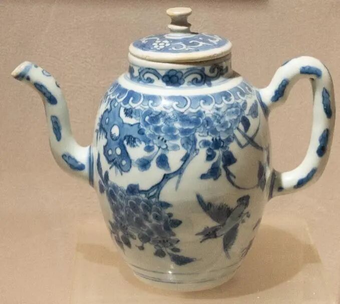 元代时,景德镇窑工匠烧出成熟的青花瓷器,深邃内敛的蓝釉白底流行海内外,是极为经典的釉下彩瓷。这件青花执壶器表以青花绘制大幅花丛装饰,其中飞鸟肆意灵动,与执壶圆身之上又增添了些许空间感。