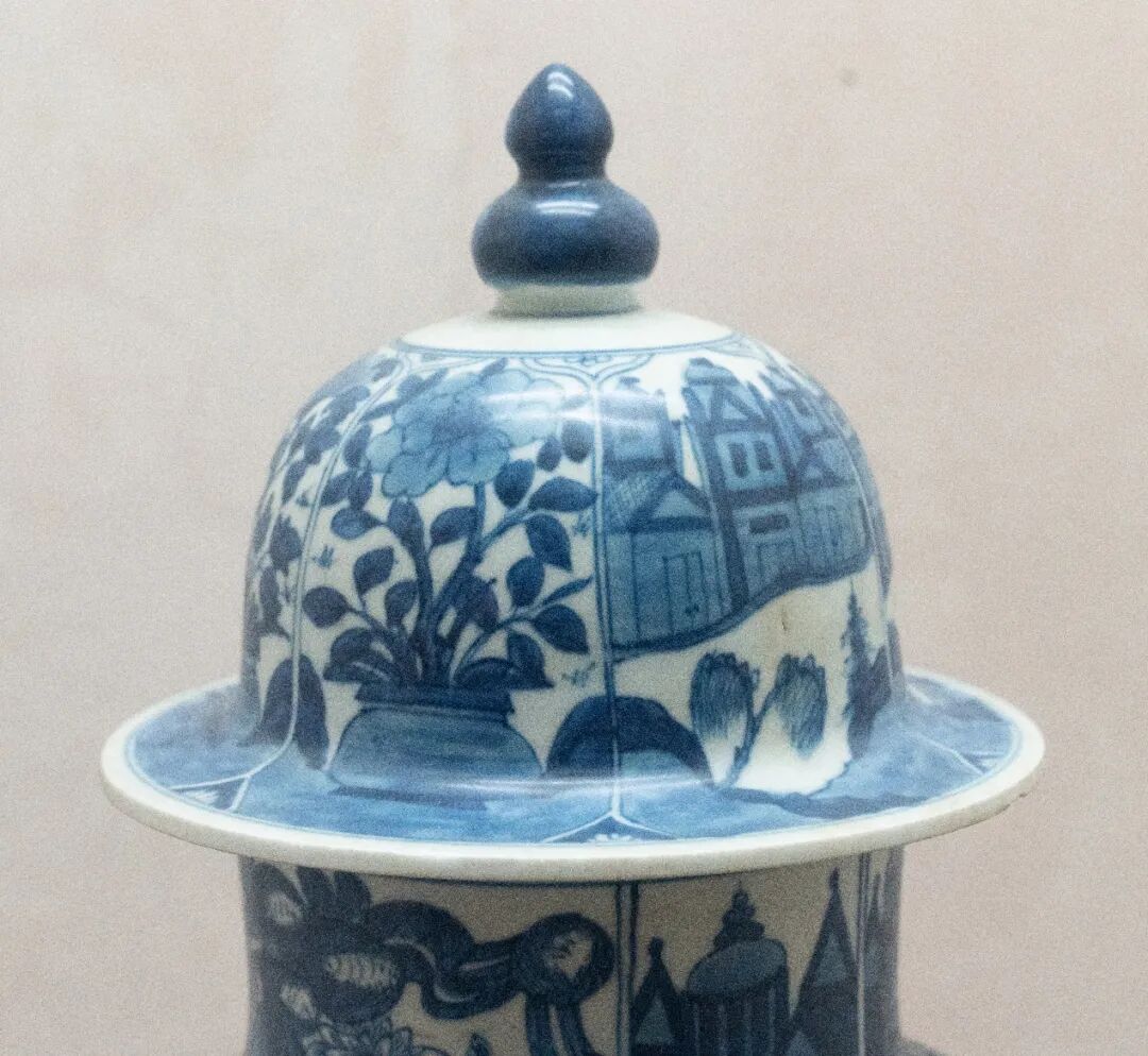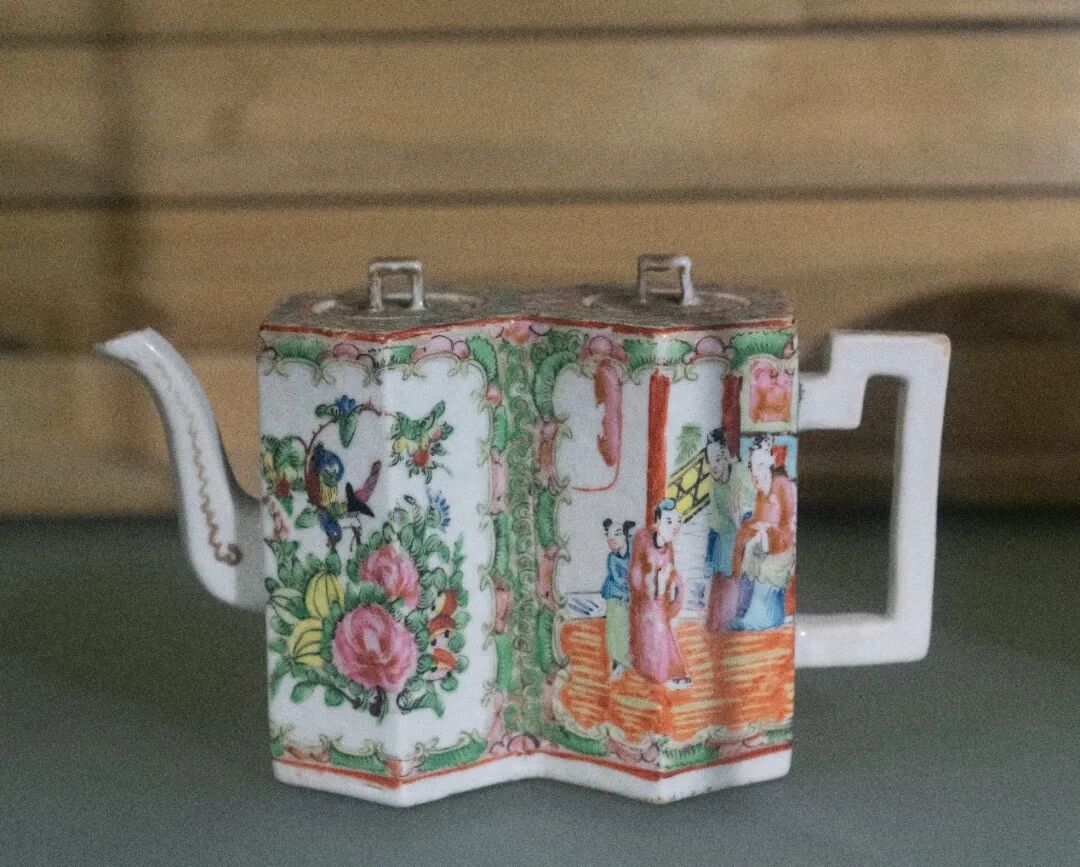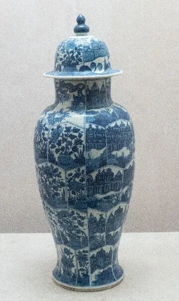 康熙时期常见外销瓷,瓷上装饰纵分成两种不同的风格:一半在六边形的开光内绘有高耸入云的西洋宫苑;另一半在开光中装饰花团锦簇的各式花卉盆景,绽放祥瑞之色。