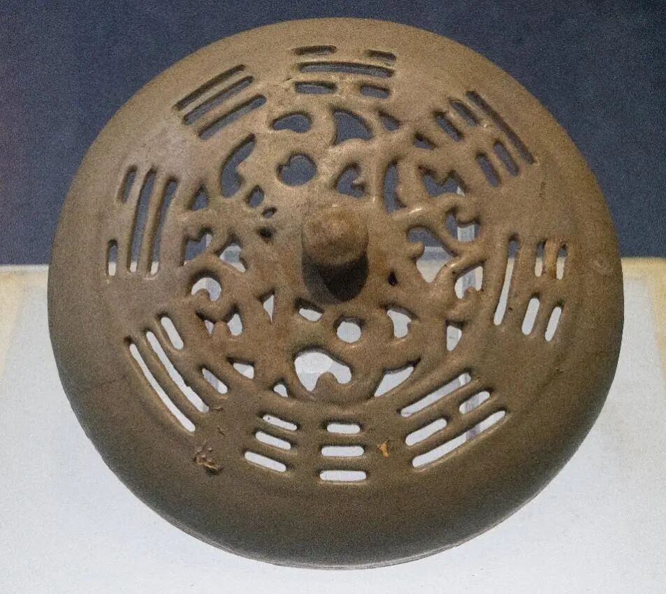 熏炉为熏香之用,香烟自炉盖镂孔升起,丝丝缕缕,最动人心。这件南宋官窑熏炉盖将炉盖需要的镂空设计为内圈花草纹,外圈八卦纹,将装饰与出烟口巧妙结合,是工匠的巧思妙构。