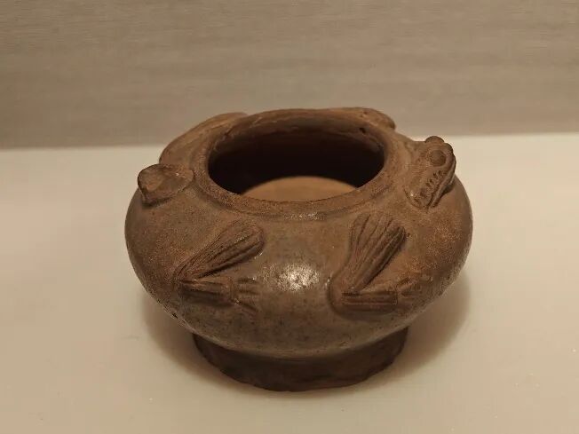 水盂作为文房用具,在烧造创制过程中其型多样,这件东晋青瓷水盂为蛙形,水盂口沿外侧分别塑有蛙头、蛙尾与四足,蛙头双目圆睁,其身以褐彩装饰,圆身与圆器相契,是仿生造型之佳器。