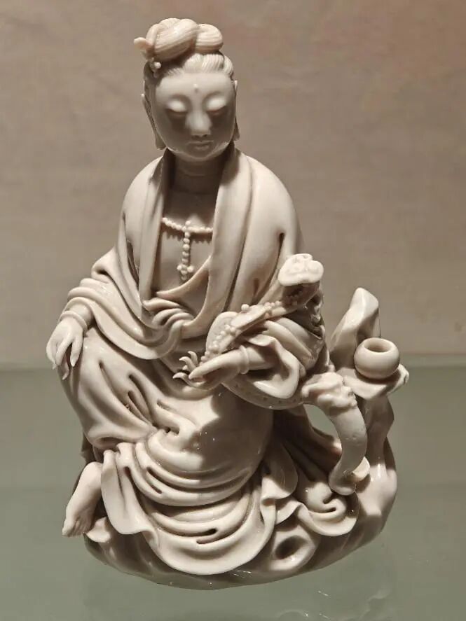 德化窑白瓷名动天下,其色又称“猪油白”、“中国白”,这件观音白瓷像,整体如玉脂一般,菩萨面容雍容饱满,慈眉善目,发丝与指尖处细节皆刻划细致,尤其是其堆塑在底部的外衣更是彰显了德化白瓷的惊世技法。