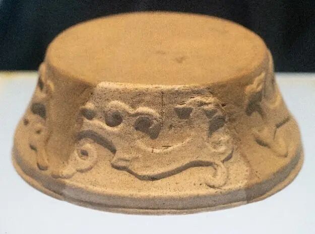 这件器座虽为素烧,不见釉层,其侧面壁上却饰有相向的一对凸雕夔龙纹,圆目翘角作前行状,效果传神动人。