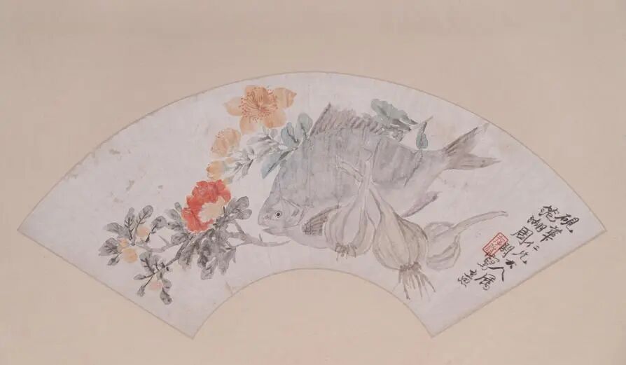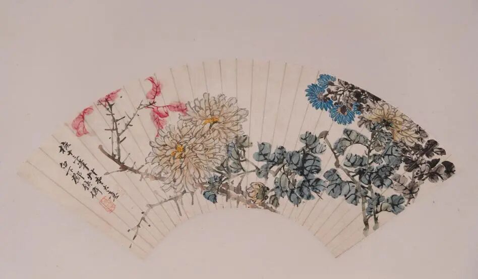 扇面题款:“砚华四兄大人雅正。己巳九秋写于海上。馀伯费以耕。”钤印:“召龄”朱文方印。费以耕,生卒不详,字馀伯,乌程(今浙江吴兴)人,费丹旭长子。画承家学,善绘仕女,兼工花鸟,清雅绝俗。
