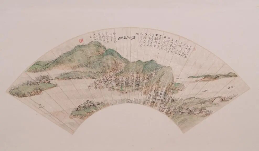 扇面题跋:“石湖,界吴县、吴江之间。相传范蠡入五湖之口,宋参政范大成居此。孝宗书‘石湖’二字赐之,名‘石湖别墅’。上有普陀岩石,镂观音大士像,因名石佛寺。水乃苏郡白阳湾所汇也。”题款:“学文待诏,设色。奉学林贤契文坛哂正。戊辰端节,云泉老友溥学画写。”王溥(1796-1850),主要活动于清嘉、道时期。字云泉,江苏太仓人。官四川大足典史。画境益苍茫沉厚,与吴镇为近。
