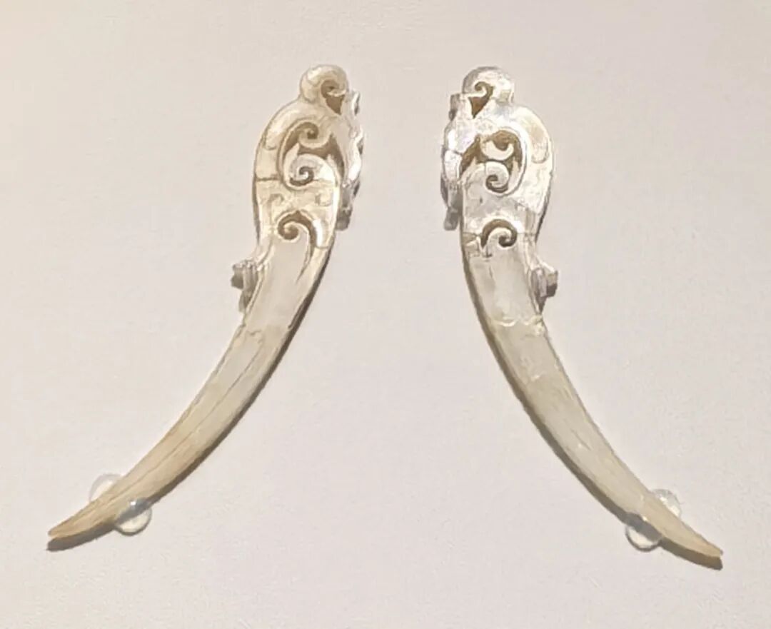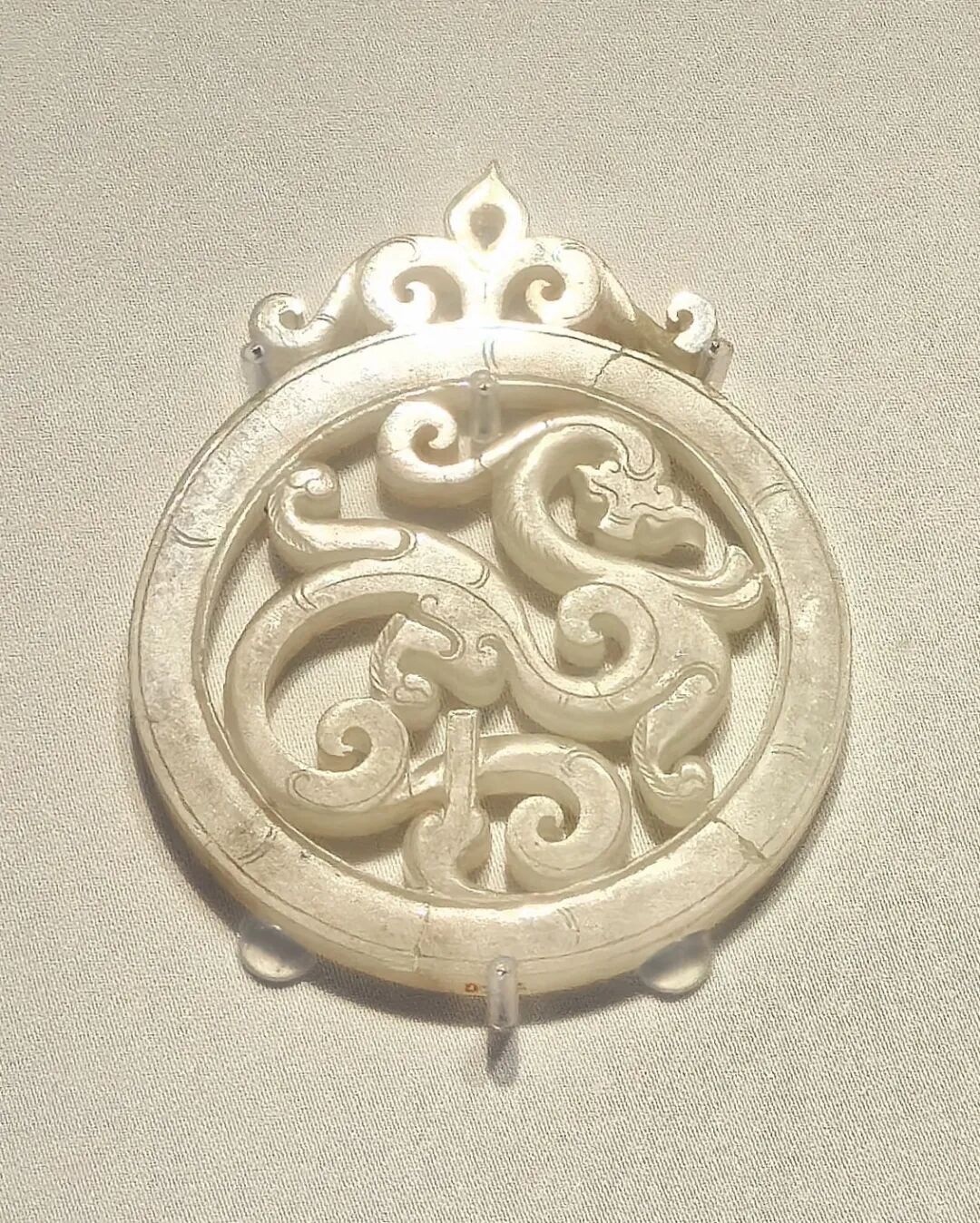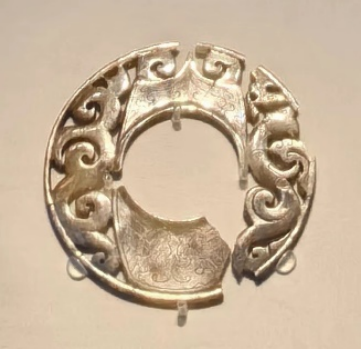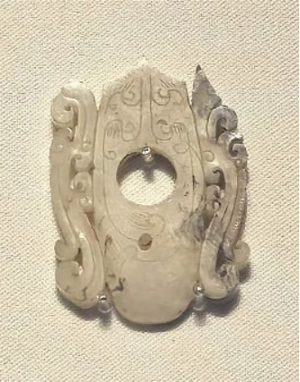 这组玉佩饰出自西汉广阳顷王刘建及其王后合葬墓,玉质洁白,器型多样,有玉璧、玉佩和玉觽,雕刻纹饰精美灵动。玉璧为镂空龙凤纹,玉佩雕刻有缨花和螭虎,玉觽则两面镂空,线刻回首飞凤,设计精巧,繁简得当。这组玉配饰是墓主夫妇生前的珍爱之物,是身份和地位的象征。