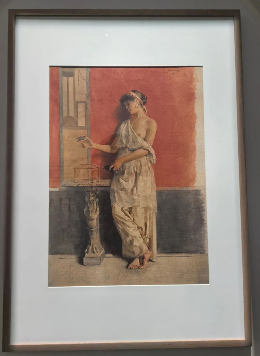 这是描绘古罗马庞贝女性的一幅水彩画。画像中正在喂食小鸟的女性,正享受着悠闲的时光。她身着丘尼卡,这是一种类似于现代的连衣裙的服装,由轻薄柔软的布料,如羊毛、亚麻等制成。丘尼卡的长度可及膝盖,可以搭配腰带,是一种不分性别,各个年龄和阶层的人都可以穿着的服饰。从穿着打扮来看,画像中的应该是一位还未结婚的少女。因为已婚的罗马女性,需要穿着另一种名为斯托拉的长裙。这种长裙的肩膀处使用别针来固定,腰部系带,营造出宽松的褶皱。已婚女性在穿着斯托拉时,通常还会搭配一条名为帕拉的披肩,在室外活动时还会戴面纱。