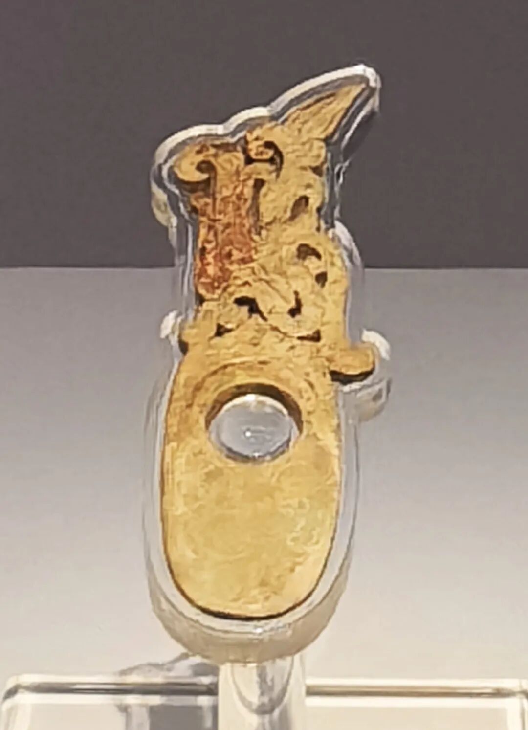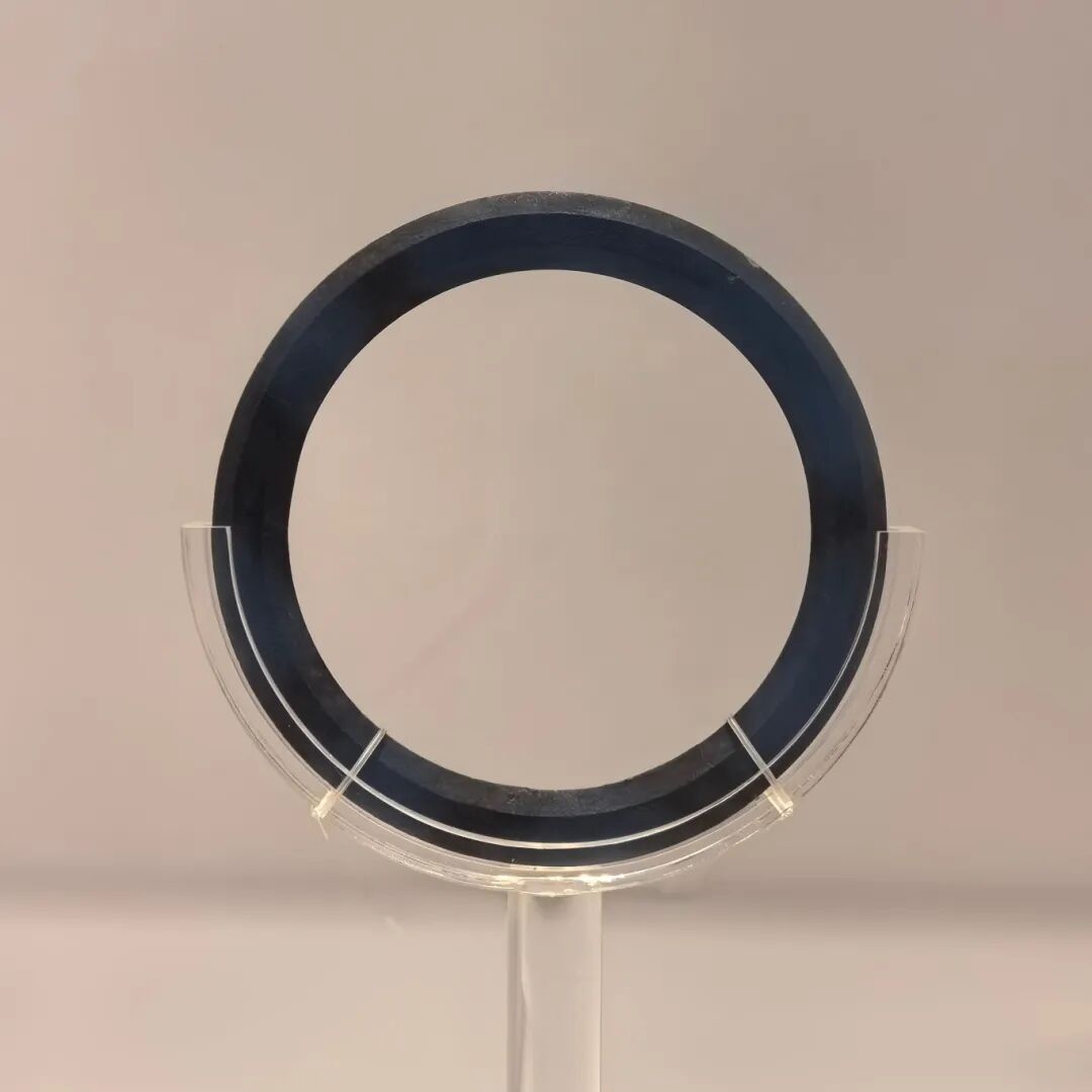 随着汉代海上、陆上丝绸之路凿空开辟,国产玻璃在融合了西方玻璃制造技术的基础上稳步提高。玻璃带钩、剑饰、蝉、环、珠饰等独具特色的玻璃饰品,在融合了浓厚的东方元素之后,出现在了女性的饰品清单之中。这件玻璃环素面无纹,通体透光,表面有黑褐色斑块,与自身的深蓝色相映衬,更显高贵神秘、色彩斑斓,应是墓主生前的心爱之物,也是西汉贵族女性配饰风潮与审美追求的重要物证。