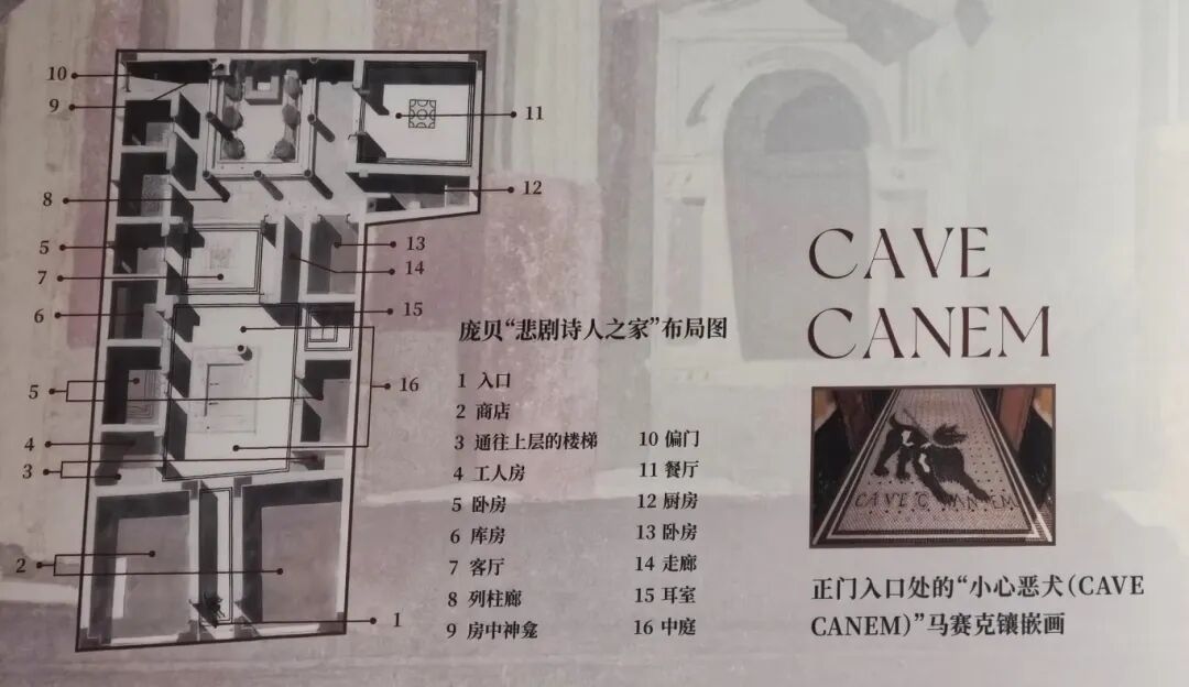 庞贝“悲剧诗人之家”建筑建造于公元 63-79 年,一直以来被视为反映庞贝家庭生活的重要考古学材料。最早的研究者以壁画的内容是一位诗人在吟诵一出悲剧,而给这套宅子命名为“悲剧诗人之家”。这套住宅“小而全”,虽然面积不大,但它拥有罗马住宅的基本特征,而且室内壁画精美,是我们认识古罗马住宅构造的很好范例。房子门口还有一幅著名的马赛克画作“CAVE CANEM(小心恶狗)”,似乎在表明家与社会的边界。