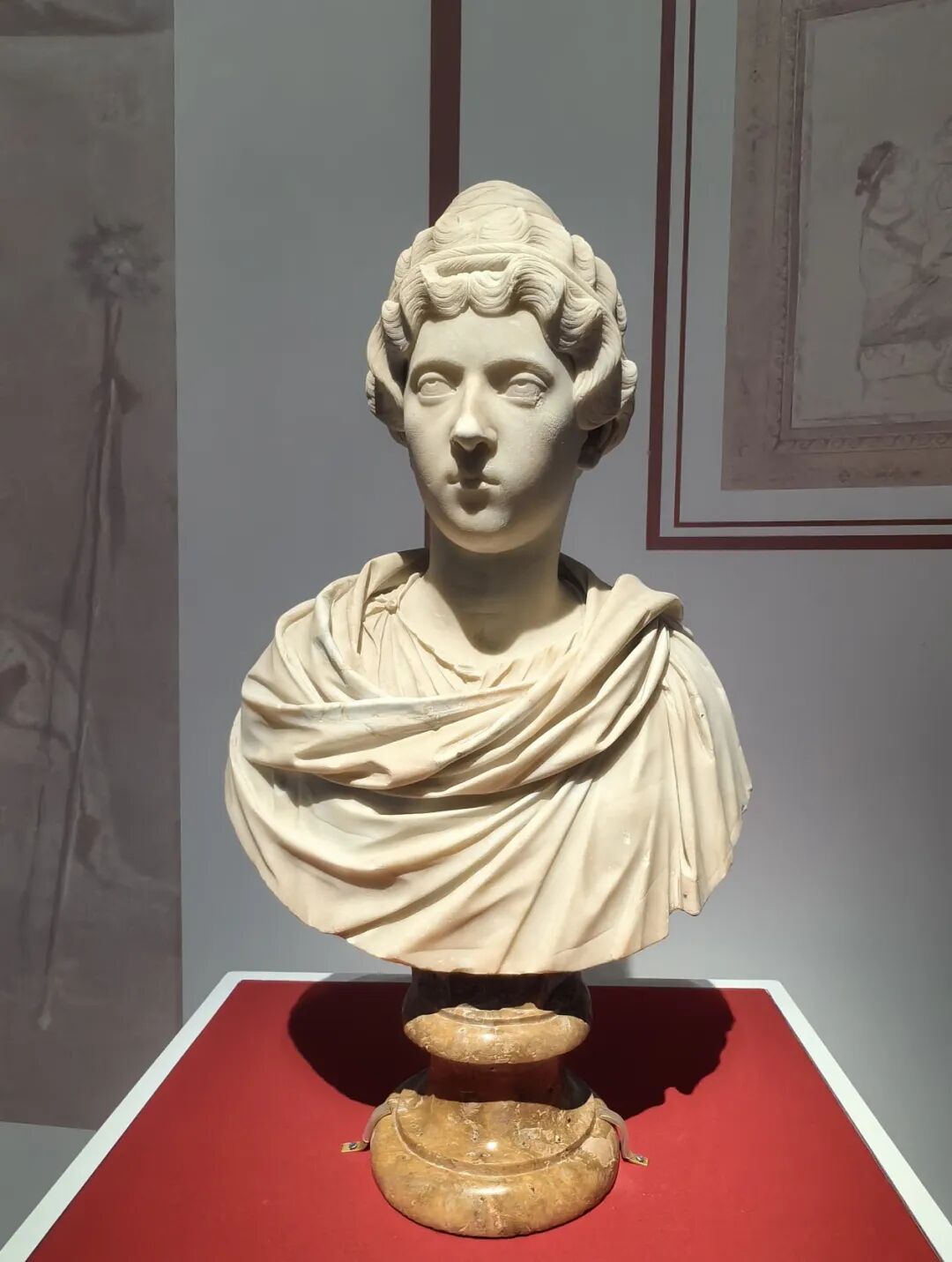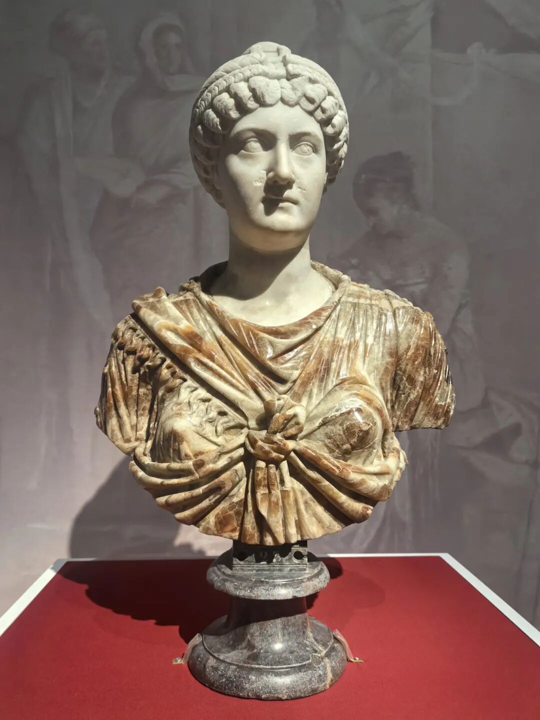 尤利亚·多姆纳(Julia Domna)是塞普蒂米乌斯·塞维鲁(Septimius Severus)皇帝的妻子,即罗马帝国的皇后,并以她的智慧和政治能力而闻名。塞维鲁在位期间,尤利亚更多的是扮演皇帝的顾问,尤其在他远征期间。在她儿子卡拉卡拉和盖塔短暂统治时,她作为皇太后继续扮演重要角色。同时,她的影响力延伸到宗教和哲学领域,这也使她成为了艺术作品的重要题材。