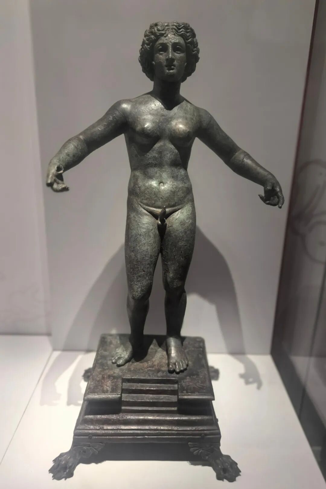 赫马佛洛狄忒斯青铜雕像是希腊神话中的一位阴阳神,是神使赫尔墨斯与爱神阿佛洛狄忒之子,拥有男性和女性的双重特征,常以少女的形象出现。这座雕像的尺寸小于真人形象,是对希腊晚期雕像范式的再创作。它最初应用于支撑某种托盘,它是贵族府邸中装饰宴会陈设的典型雕像。