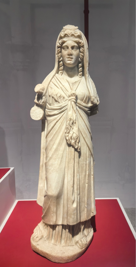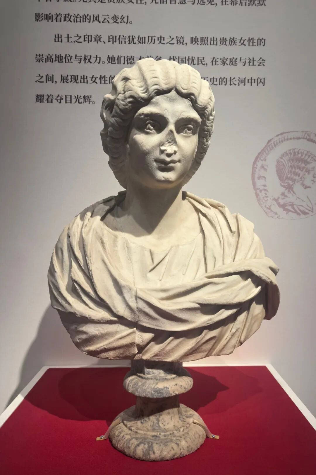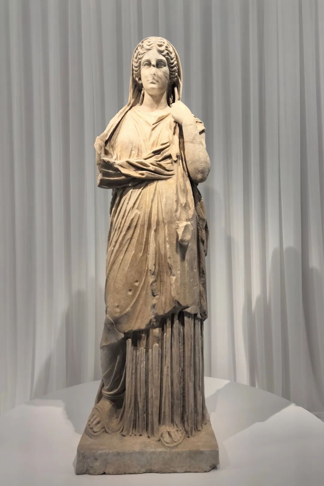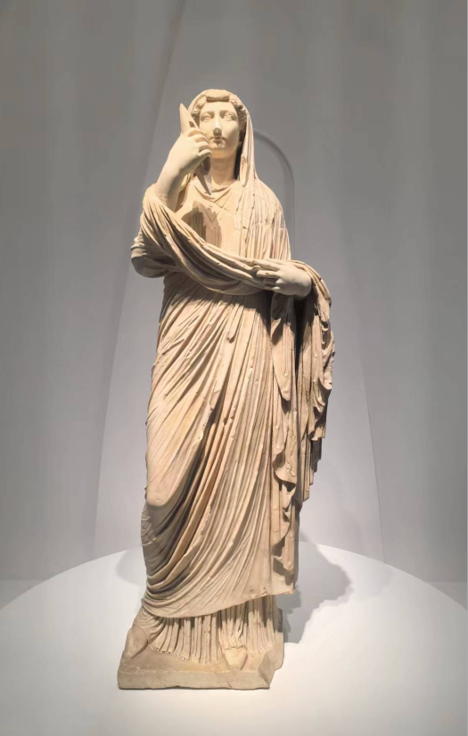 这尊雕塑描绘的是一位古罗马贵妇人。她头戴面纱,身着长衫,正是罗马帝国时期国力强盛,丝绸之路连通东西,商贸往来繁盛的真实写照。在帝国荣耀之下的罗马女性在家庭生活、私人事务乃至于法律地位上享有相对的自由。罗马艺术中塑造的女性形象和女性时尚都极具特色,传递出古罗马女性的美和她们内外双修的审美追求。在这件雕塑作品上,我们与一位古罗马时期的女子相遇,通过一抹面纱见证文明交流的可能,或许她头戴的面纱正出自一位东方女性的巧手。她的矗立是文明的见证,是生命的延续,也是美的永恒。