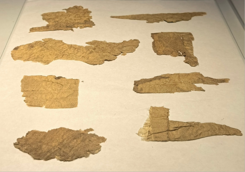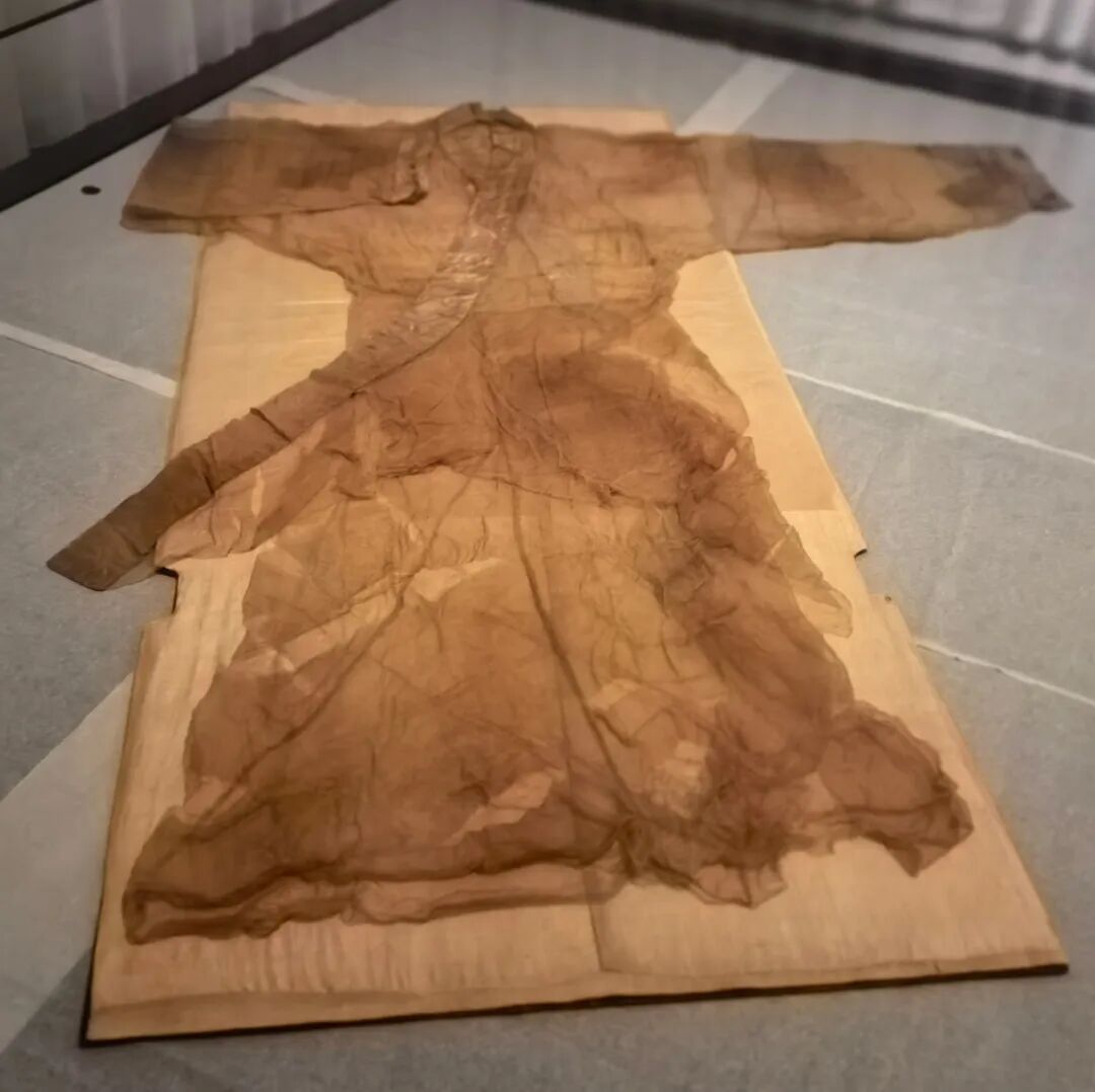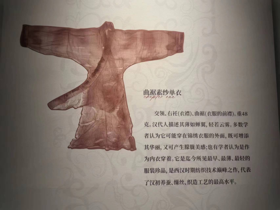 这次展览首次公开展出了自 1972 年出土于长沙马王堆1号墓的马王堆曲裾式素纱单衣。这件曲裾式素纱单衣交领右衽,衣料为轻薄、没有染色的平纹方孔丝织物素纱,袖口和衣领用织锦做装饰。整件单衣薄如蝉翼、轻若云雾,仅重 48 克。从视觉上能产生极其华丽飘逸之感,彰显了汉代贵族女性对高级面料和精致工艺的追求与独特的审美意趣。