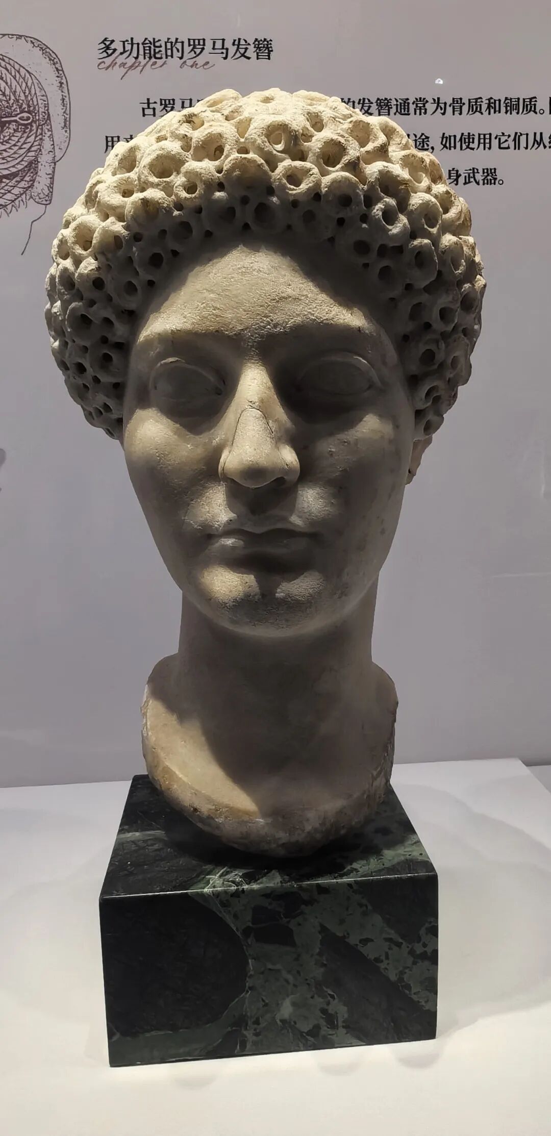 公元一世纪末,罗马帝国进入鼎盛时期,被称为帝国的“黄金时代”。这一时期商贸发达,文化多样,女性发型也变得更加精致和复杂,包括多层次的卷发、复杂的编织和丰富的装饰品,并会紧跟美发潮流而改变。这些发型需要专业的发型师来打理,有时也会用指甲花、番泻叶、姜黄等来染发,还会用天然假发来增加发量。这尊女性头像的卷发被仔细地拢起,高高地盘在头顶,是当时罗马最为时兴的款式,在古罗马雕塑作品中经常见到。