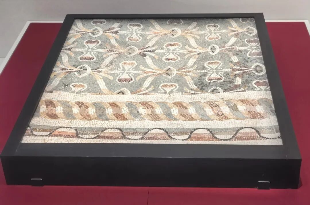 罗马帝国时期,马赛克艺术得到了空前的发展,这种由彩色的小玻璃片、石子、贝壳乃至珠宝拼嵌而成的图形或图案,被广泛应用于民宅及公共建筑的地板、墙面。这件马赛克镶嵌地砖,有显著的西方风格,几何化的图案从视觉上塑造了独立的空间,增加了住宅建筑的立体感和纵深感,同时也形成了强有力的视觉冲击以及多样的装饰风格。