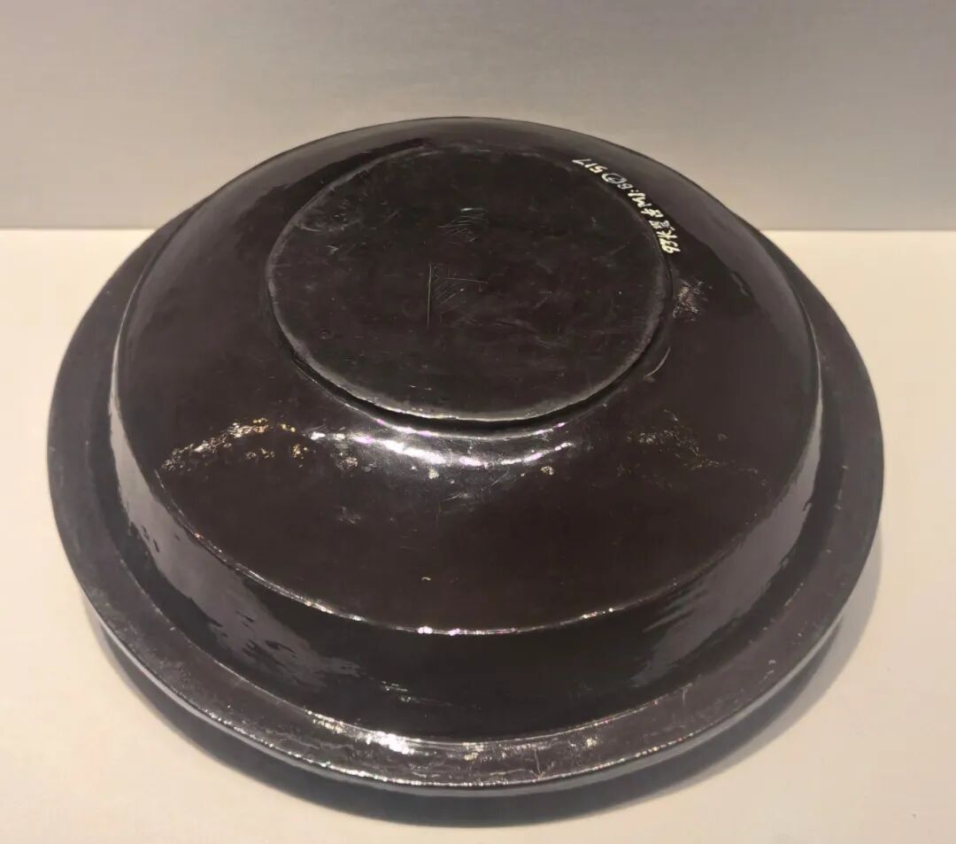 盘用途多样,在饮食时多用于盛食,这件漆盘出土于望城坡长沙国渔阳王后墓,底部刻有“渔阳”二字铭文,造型简约、实用美观,与马王堆汉墓出土的漆器基本类似,为西汉时期常用的盛食器具。中国是世界上最早发现天然漆器并加以利用的国家,漆工艺的发展在西汉时期步入黄金时代,尤其实用漆器种类于数量剧增,占据西汉社会生活的重要位置,常见于西汉饮食生活器具中。