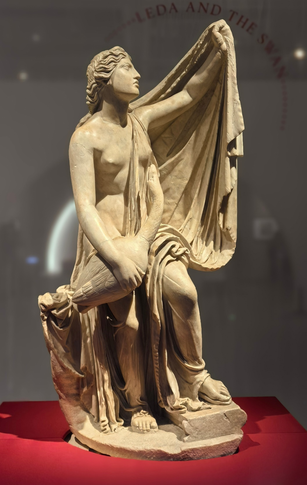 这件展品讲述的古希腊神话中的著名故事“丽达与天鹅”,丽达原是埃托利亚国王的女儿,即海仙之女,她嫁给斯巴达王廷达瑞俄斯,因其丈夫忘了向美神阿芙罗蒂德祭祀,遭到这位女神的报复。一天,宙斯化作一只天鹅,阿芙罗蒂德化作一只鹰追逐他,丽达正在湖池沐浴,见一天鹅飞落湖边,就把它抱在怀里,引起怀孕,生下了四只天鹅蛋,蛋中孵出四个神。作品的主题是生命繁衍,蕴含人类生育的意象与价值。