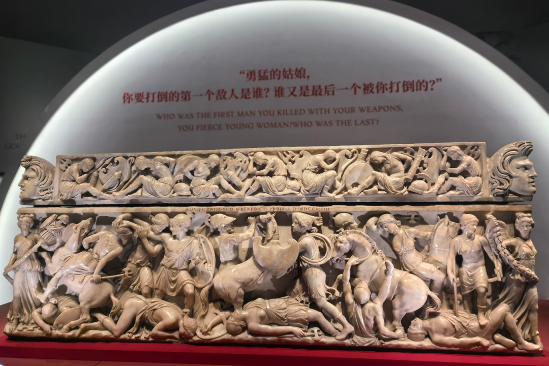 亚马逊女战士是古希腊神话中的一群传说人物。据传说,她们居住在黑海附近,是由女性组成的战士部落。她们被描述为勇敢而独立的女性,擅长骑马和使用武器。她们曾与希腊人发生了多次战争,这副石棺所描绘的正是亚马逊女战士与希腊人战斗的场景。亚马逊女战士也可以像男人一样拿起兵器,来捍卫自己的国家与信仰。