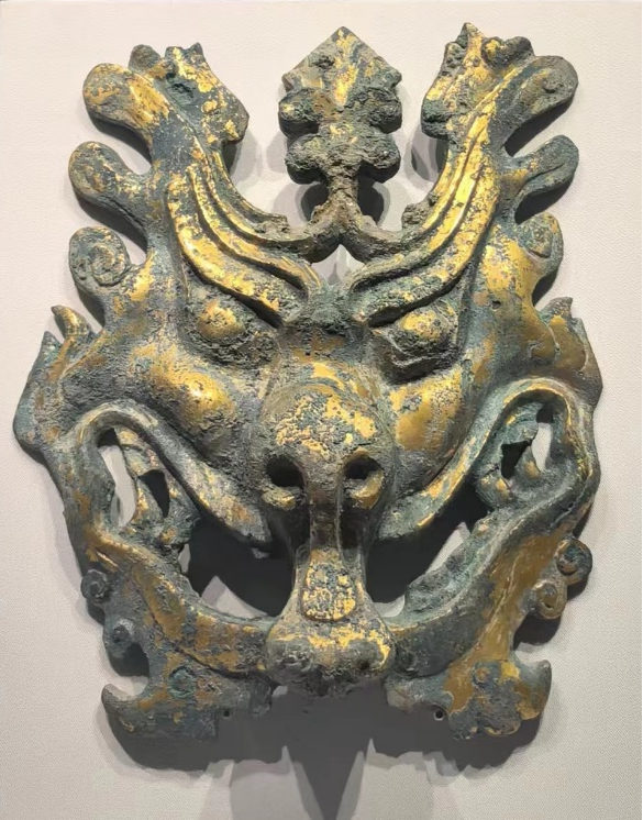 铺首又称门铺,是古代建筑物门的装饰构件,主要作用是用来启闭门扉或者叩门。铺首的形制多样,有做成怪兽面,像椒图、饕餮、虎、狮、螭龙、龟蛇等凶猛兽类,取其看守门户、镇守邪妖之意。这件鎏金铜铺首出自广阳顷王刘建墓,器形硕大、雄浑壮丽,彰显皇家的权利与气势。