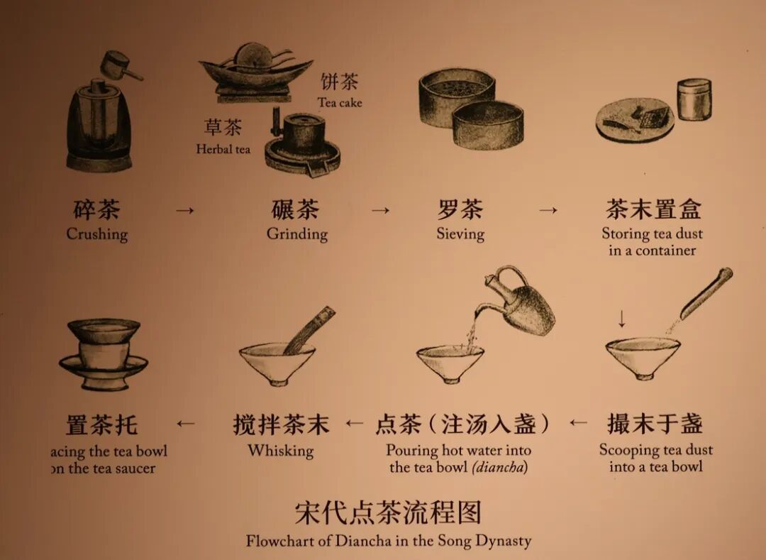 至宋代,点茶法成为时尚。点茶法是将茶叶末放在茶碗里,注入少量沸水调成糊状,然后再注入沸水,或者直接用茶瓶向茶碗中注入沸水,同时用茶匙搅动。