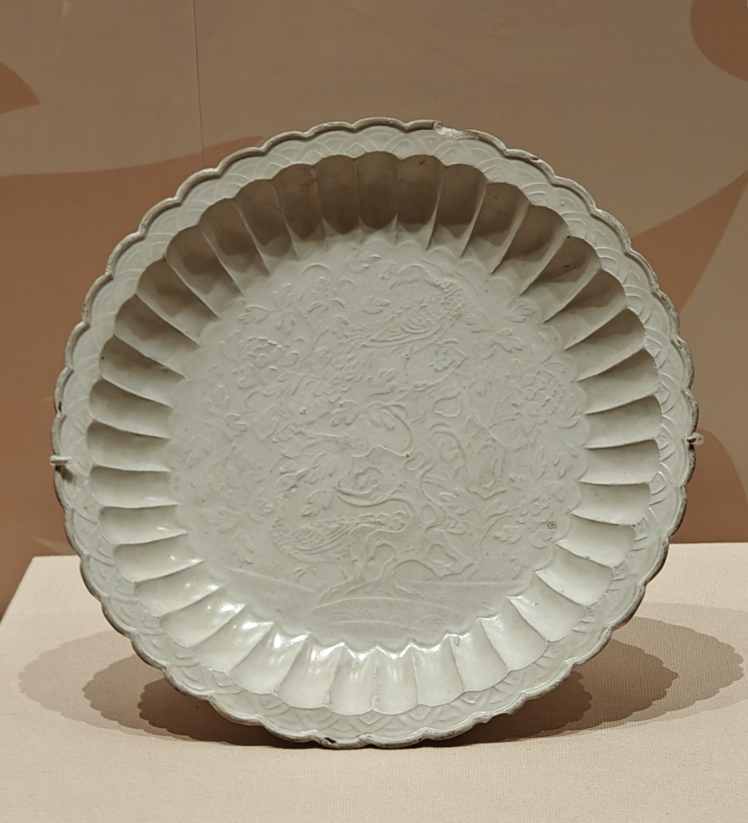 金 定窑白釉印花凤凰牡丹菊瓣口盘,两只凤凰落在牡丹枝头,相互鸣叫