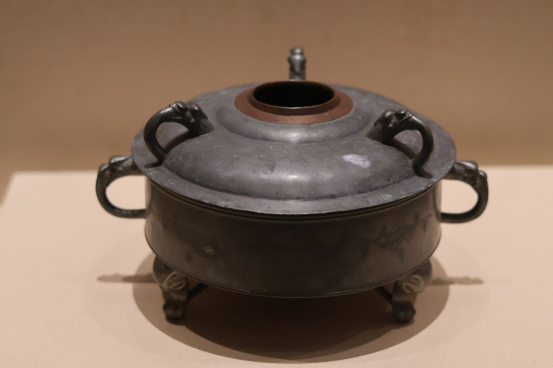 此为满族传统的火锅,器中间的圆柱内用来盛放炭火,周边放水。炭火加热后,在开水中将肉片边涮边吃。这种器皿及涮锅子食法至今仍流行于中国北方地区。
