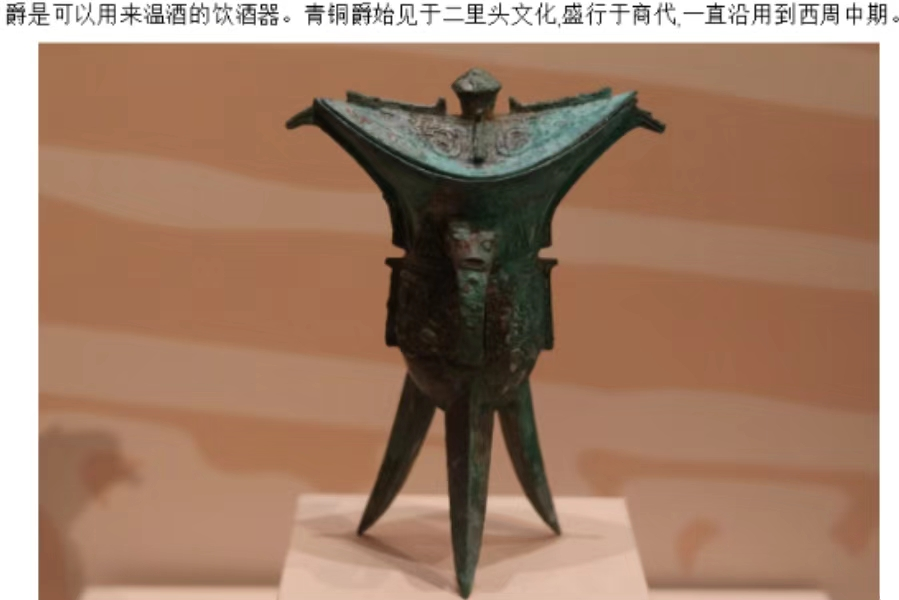 爵一般是用以温酒的饮酒器。青铜爵始见于二里头文化,盛行于商代,一直沿用到西周中期。