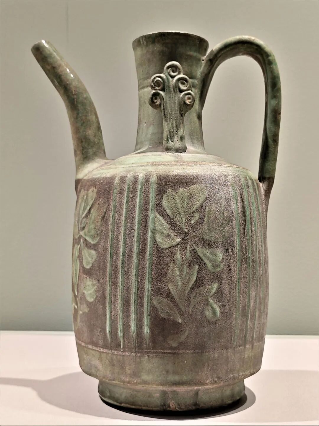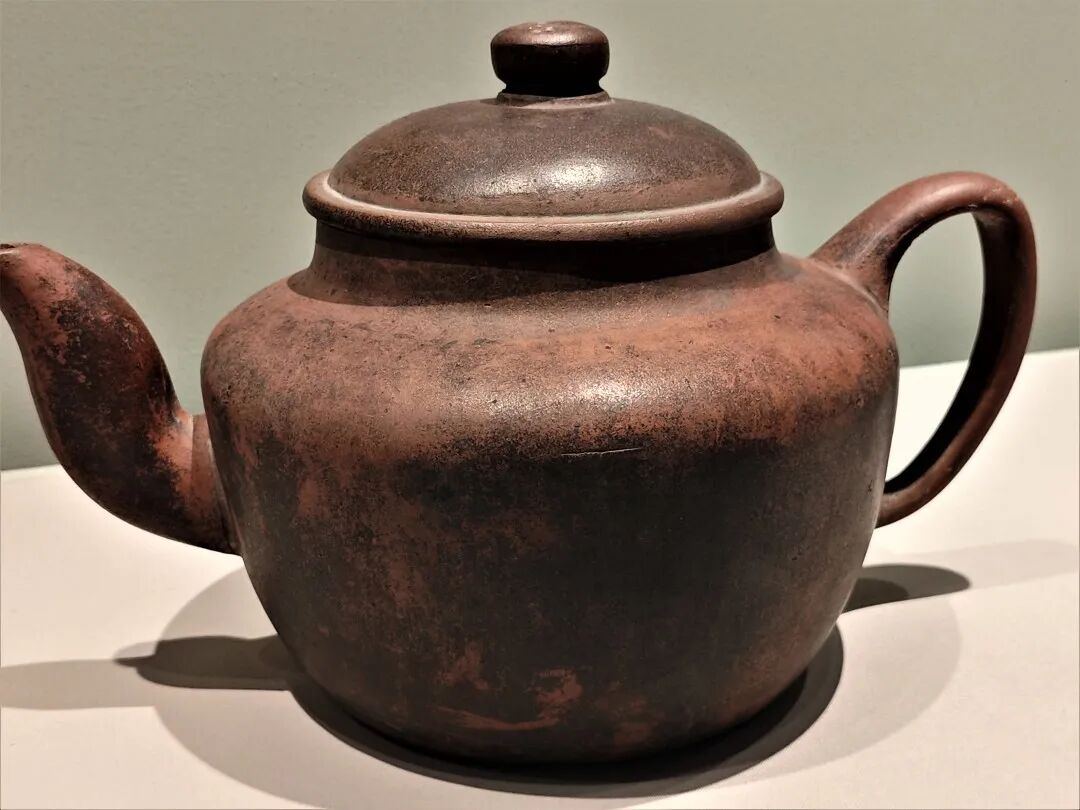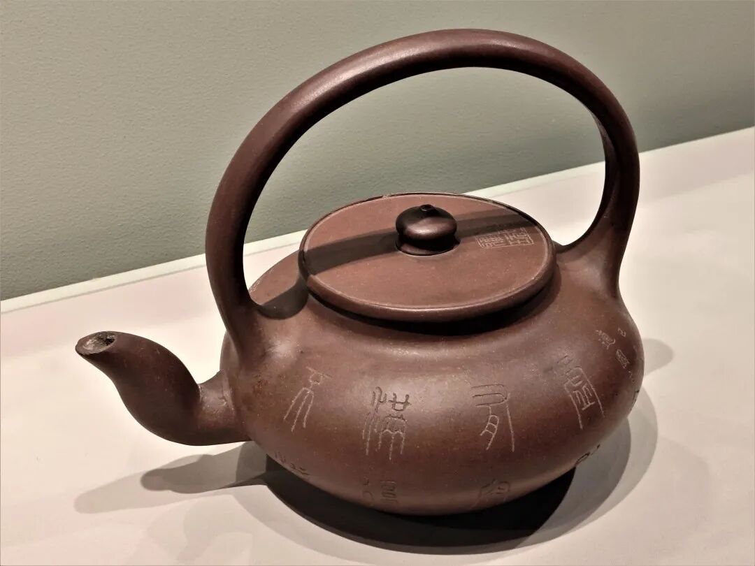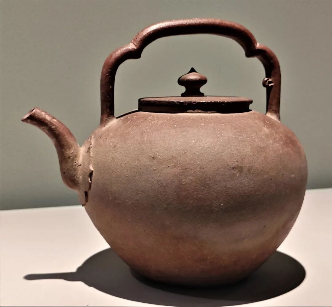 这件出土于江苏南京明代私立太监吴经墓的紫砂提梁壶,制作年代不晚于嘉靖 12 年(1533 年),是目前所见年代可考器物中时代最早的紫砂壶。其弧形与同一时期画家王问所绘《煮茶图》上的提梁弧造型一致,互为对照。