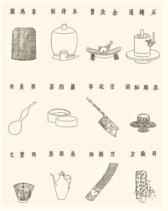从图中可以看出,《茶具图赞》共列出12种茶具,有趣的是,作者审安老人给每个茶具不仅根据他们的材质或用途起了姓氏,还给他们封了官职,比如葫芦形“胡员外”用来量水,石头做的茶碾转来转去叫“石转运”,注水用的壶叫“汤提点”。“汤”为热水,“提”为提起,“点”则是点茶之“点”,连起来即是“提水点茶”之意;而“提点”又为宋代官职,含“提举点检”之意。