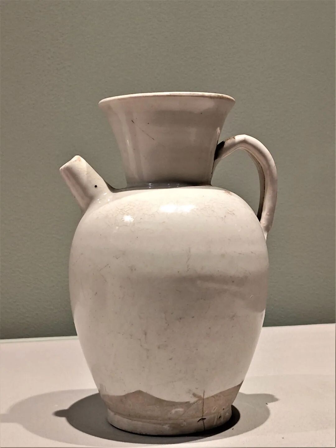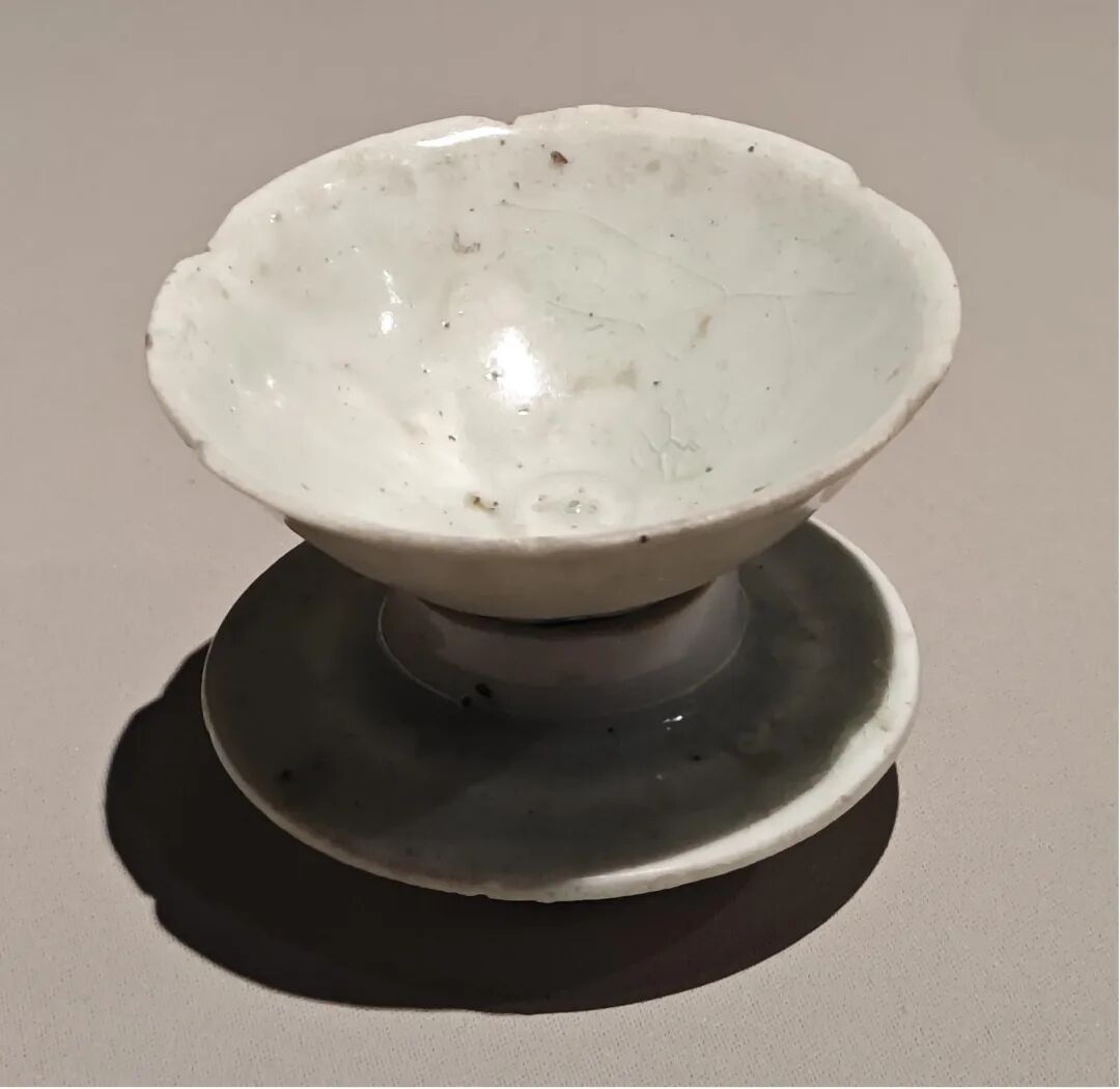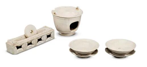 这套 2022 年出土于山西长治屈家庄村唐墓的白釉茶具组合。囊括了茶碾、茶炉与茶釜(该器物的茶釜与风炉连为一体)及茶盏托,器物十分精美,组合完整,是唐代茶室的最新考古成果之一。反映了基础的煎茶法:先用茶碾碾茶饼(左一),风炉内放置炭火,茶釜中依次放入适量的水、盐、茶粉(左二),最后将茶汤添入茶碗以盏托饮茶。