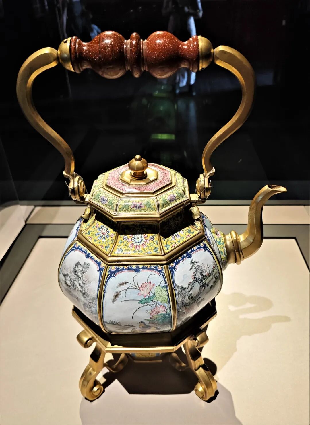铜胎画珐琅开光山水花鸟图八棱提梁壶
