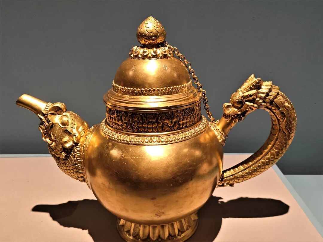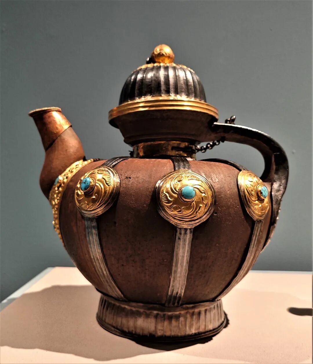 多穆壶是藏人拌、盛熬制完成的奶茶或酥油茶的器皿。多穆壶的造型一般为直筒,顶部的口沿呈僧帽状,在壶身处有把手和壶嘴,清宫的多穆壶样式丰富且实用。