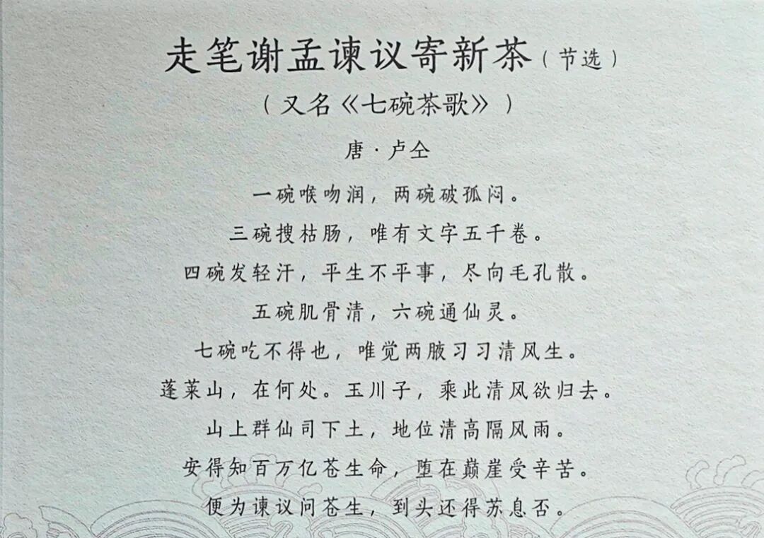一杯清茶,让诗人润喉、除烦、泼墨挥毫,并生出羽化成仙的美境。《七碗茶歌》横空出世后,打破了初唐只重饮茶技艺的窠臼,写出了饮茶妙趣,将茶人品茗的精妙之处精确的表述了出来,将中国的茶道文化一下提升到一个空前的高度。玉川煎茶也成为经久不衰的绘画题材之一,在历代画家笔下一直有所表现,比如元代钱选、明代丁云鹏都画过玉川煎茶图。