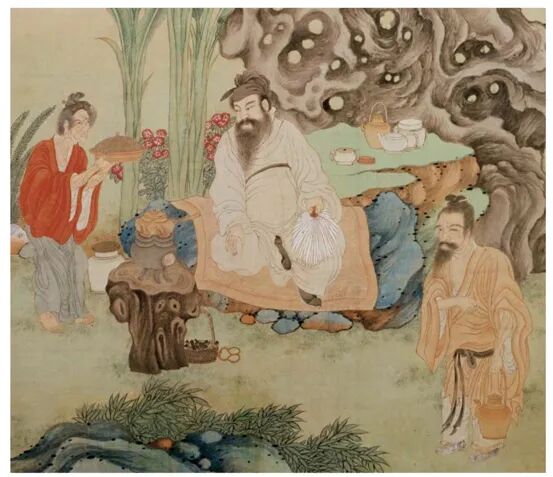 主人坐在藤墩上指挥仆从们穿梭服侍。将所藏画轴古瓷呈上,以供宾客欣赏。岸边有两位文士,丝毫没有受到嘈杂环境的干扰。在专注翻阅品评,完善画册。一名童子正在屏风后以风炉烹茶,一侍女托盏于宾客身后。明中期以后,这类以吟咏诗赋,鉴赏书画,古玩以及品茶、品香、弹琴等为主要活动的聚会颇为盛行。中国茶道融合了体味自然、养廉雅志、兴邦治国等多重境界,是一个万象合一的综合体。