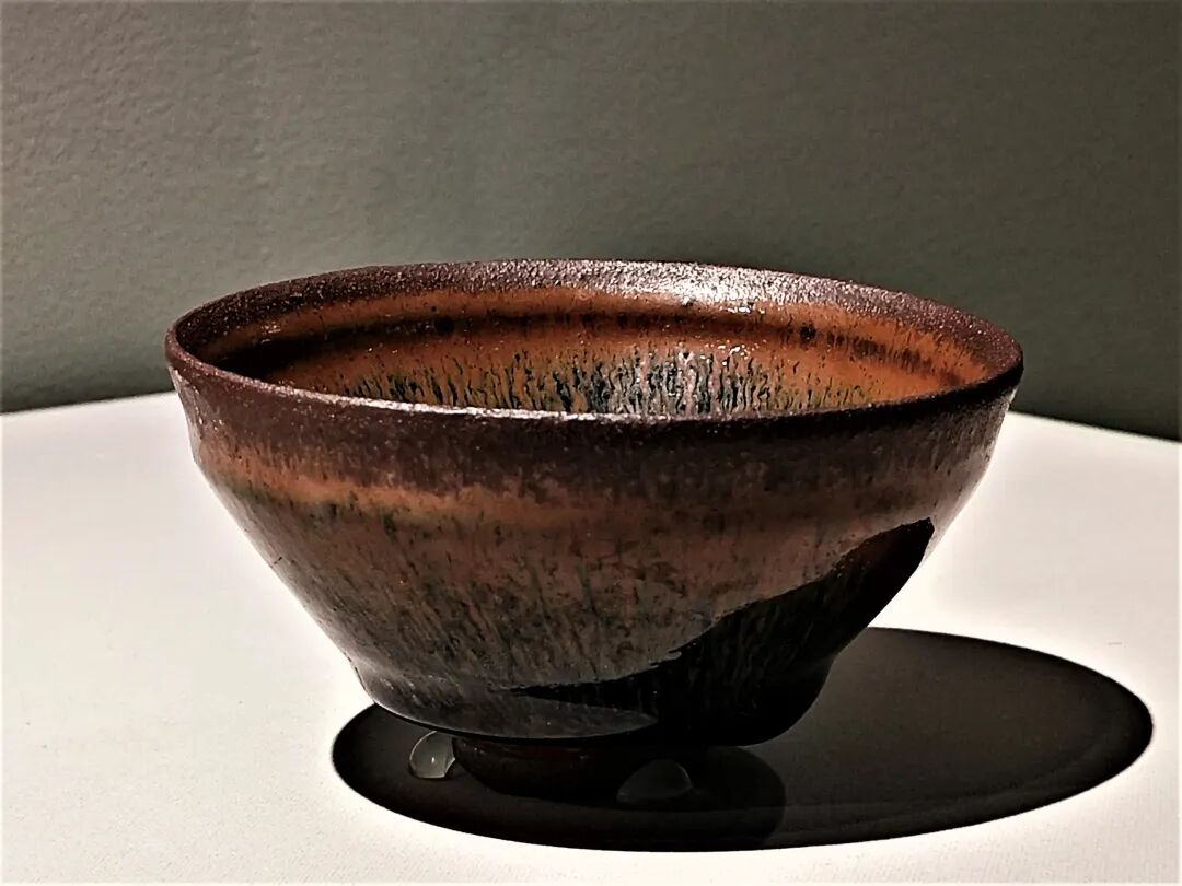 至宋代,“斗茶”之风兴起,在当今影视剧中得见。茶艺与茶具相比前朝更是讲究。茶的色香味,斗茶时的操作技巧,击拂茶汤后的呈现效果和茶沫在盏壁的存留时间,都是斗茶考评的重点。斗茶崇尚纯白茶色,因此能让白色茶墨充分呈现的黑釉盏备受人们推崇。其中,以福建建窑烧造的建盏最为著名。青釉,青白釉茶盏造型相近,也十分流行。建盏的形状口大底小,犹如一个漏斗,足够容纳翻滚而入的汤花;盏壁较厚,以维持恰到好处的温度,保证茶水可以“久热不冷”。阳光下透出的纹路如毛发细密,有兔毫斑,鹧鸪斑等不同品类。