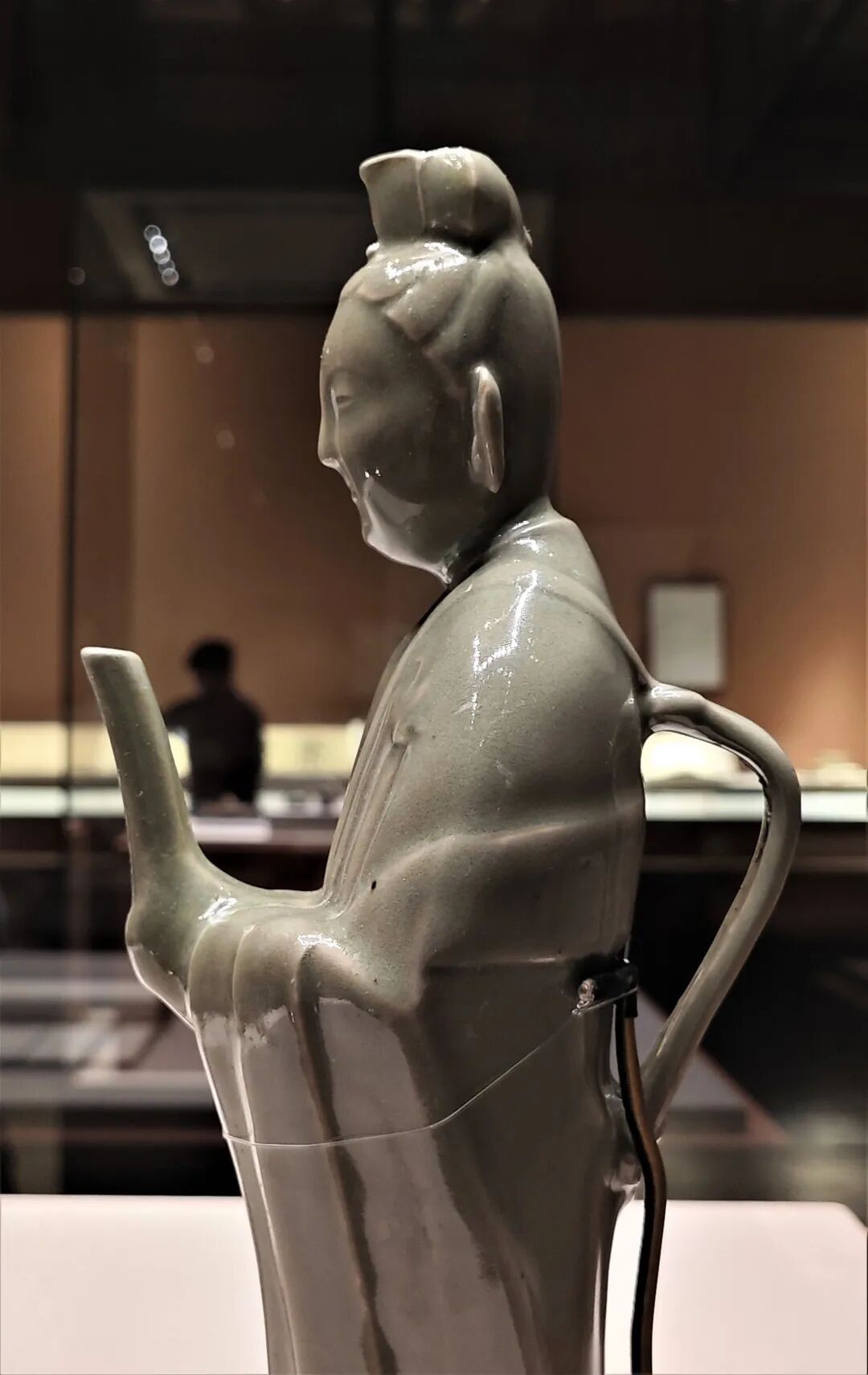 在这幅南宋画家李嵩绘的名作《骷髅幻戏图》中,傀儡艺人的担子上就有一件点茶用的曲柄茶瓶。图中的悬丝傀儡戏是宋代木偶戏的一种。只见一个附着文人衣冠的大骷髅坐于画面左边,左手骨按于左大腿骨接近膝盖处,右手提线控制着小骷髅。小骷髅对面一小儿昂首伸出右臂,正欲伸手触碰。南宋时期朝无明主,官员腐朽,王朝风雨飘摇,命悬一线。千百年来无数学者从中解读出当时的社会状态,茶文化自然也隐于其中。