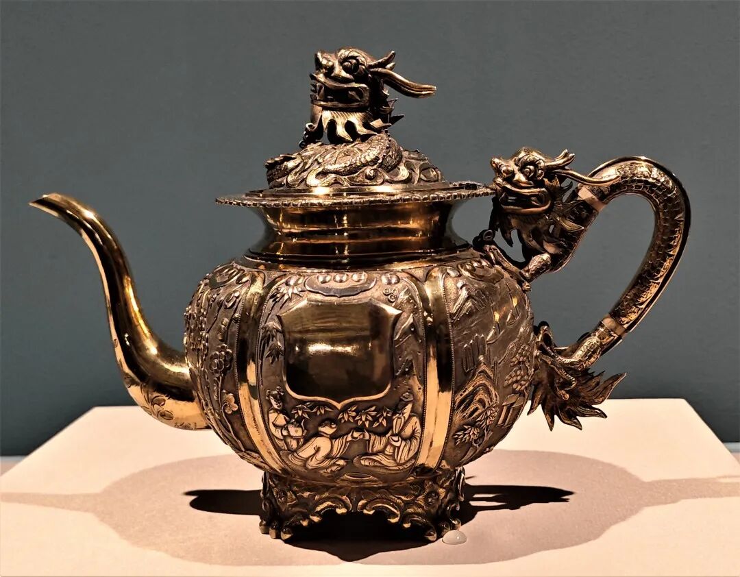 展览中还有来自英国、日本、俄罗斯的茶器精品,还有清代宫廷中使用和收藏的来自异域的茶器,以及由清宫造办处制作的外国风格的茶器。比如:故宫博物院收藏的日本银鸢尾花纹茶具套装、法国蓝釉描金寿字纹茶具、俄罗斯银刻花双耳六足盘,以及维多利亚与艾伯特博物馆收藏的“中国风”茶具、英国沃克斯豪尔瓷厂烧造的软瓷印花青花庭院图茶叶罐、德国麦森瓷厂烧造的红陶模印花卉纹壶、珐琅彩描金人物图杯及杯托等。