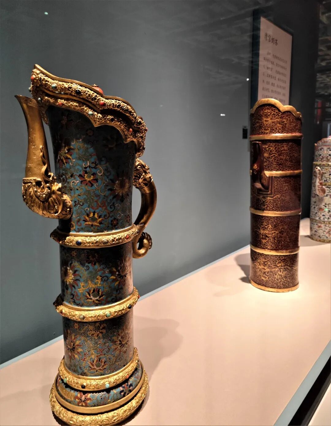 瓷质多穆壶使用粉彩工艺装饰八吉祥纹样(左一);掐丝珐琅多穆壶在装饰上融入宫廷特点兼具粗广与柔美(中);皮胎多穆壶则常用于野外活动(右一)。