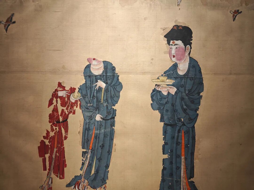 这幅托盏仕女图屏风画,为 1972 年新疆吐鲁番阿斯塔那 187 号墓出土。画中共有三位女性人物形象。右边蓝衫侍女,手捧高足托盘,盘上置一盏,似在向主人奉茶。这说明在唐代,饮茶之风已传至中国新疆地区。