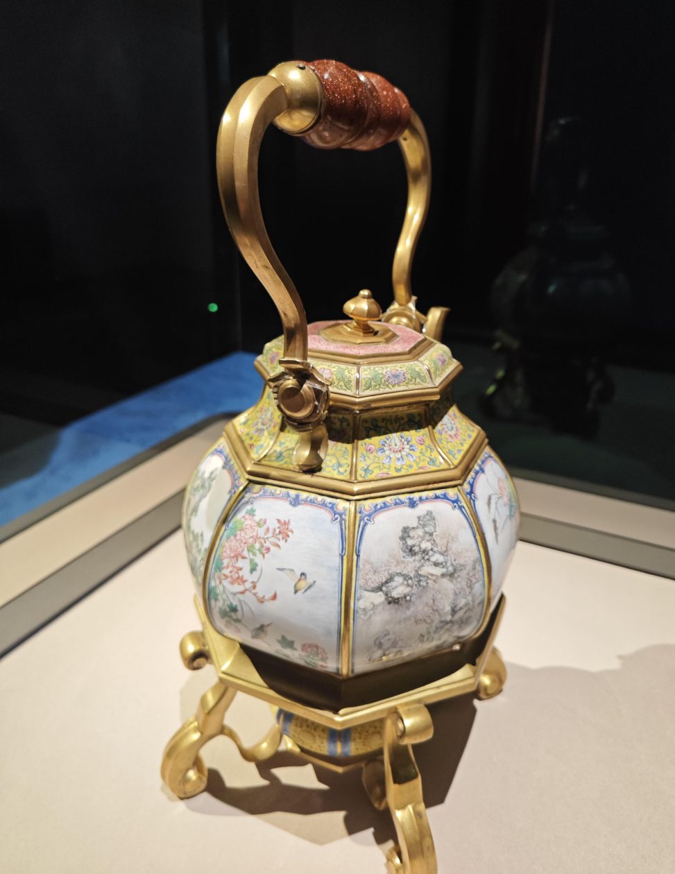 宜兴窑紫砂凸花纹诗文盖罐(左上)、银提梁方火壶(右上)、雍正款斗彩团菊纹盖罐(左下)、金爵(右下)