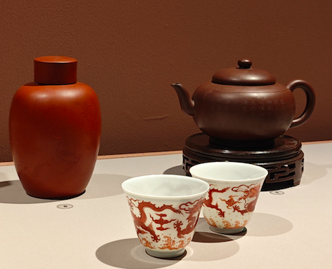 紫砂茶叶罐(左一)、宜兴窑紫砂诗句松树烹茶图壶(右上)、矾红龙纹酒杯(一对)