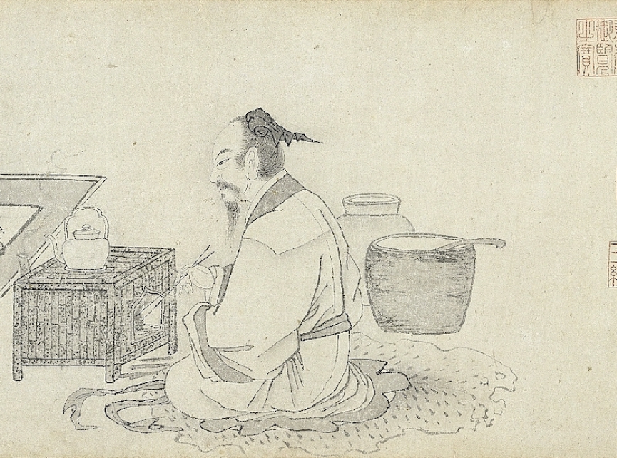 这幅《玉川煎茶图页》由扬州八怪之一清代画家金农所绘,表现了唐朝煎茶法。卢仝(约 795—835 年),号玉川子,早年隐居少室山,他家境清贫但博览经史,好茶成痴、成癖、成命。凭一首《七碗茶歌》被后世尊为自“茶圣”陆羽之后的“茶仙”。