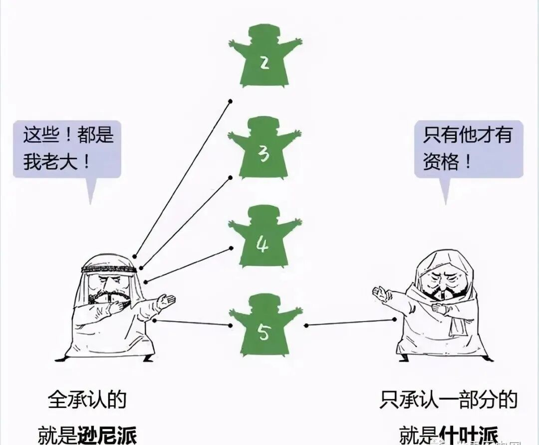 逊尼派和什叶派的分歧发生在公元 632年,当时先知穆罕默德去世了。逊尼派认为应该选举新的领袖。他们选择了穆罕默德的顾问阿布 ·巴克尔。“逊尼派”在阿拉伯语中的意思是 “遵循先知传统的人”。什叶派认为应该是穆罕默德的表弟 /女婿阿里·本 ·阿布 ·塔利布。
