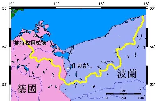 波美拉尼亚的历史边界(黄线)与今天德国和波兰的边界。